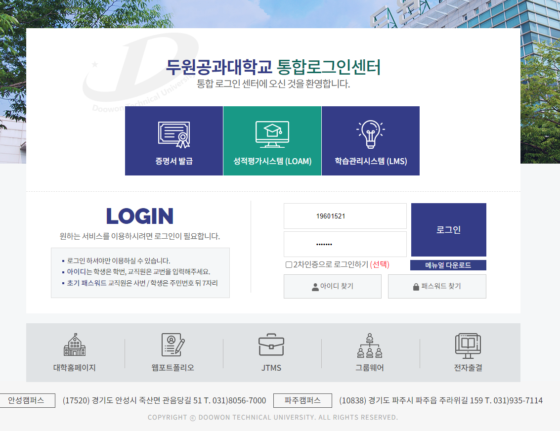 두원공과대학교 2차인증 시스템 유지보수